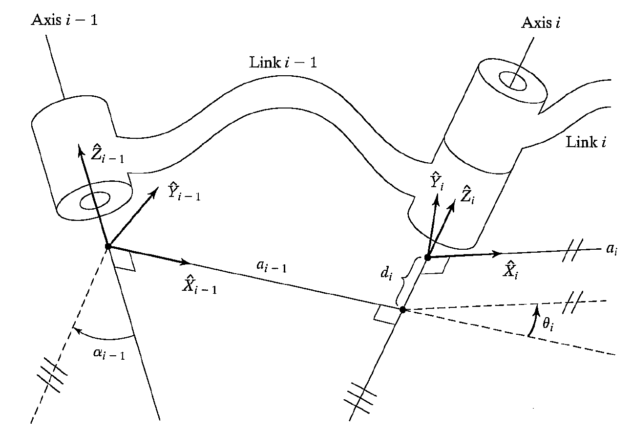 Here, a link is considered only as a rigid body defining the relationship between two neighboring joint axes ( axis \(i-1\) and \(i\), namely) of a manipulator. Joint axes are defined by lines in space.