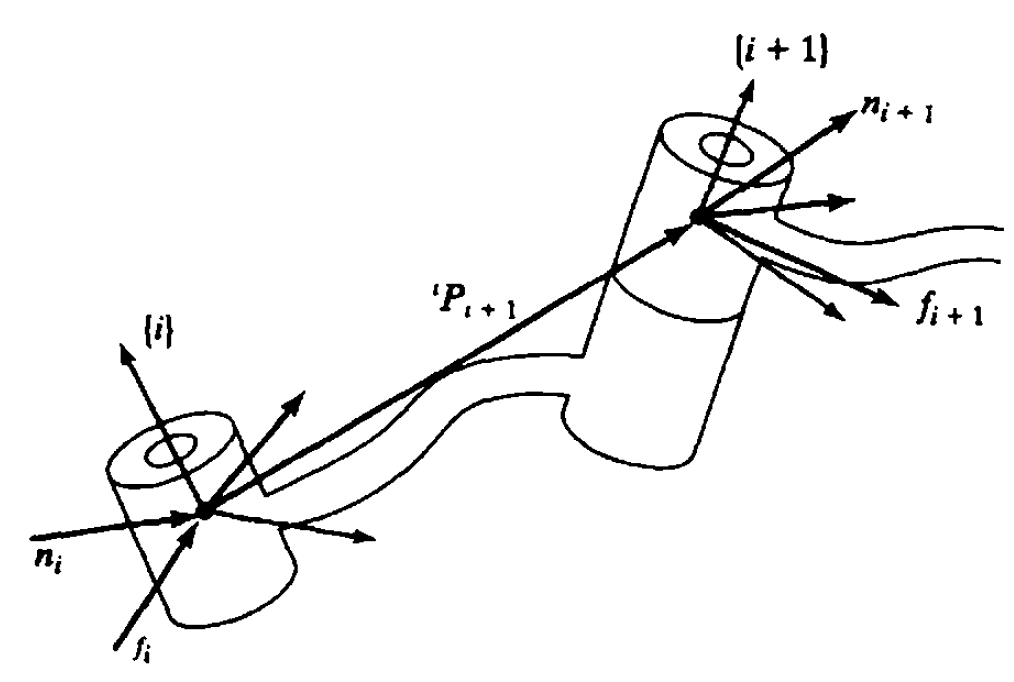 Denote \(f_i\) to be the force exerted on link \(i\) by link \(i-1\), \(n_i\) to be the torque exerted on link \(i\) by link \(i-1\). Check the following image for details.