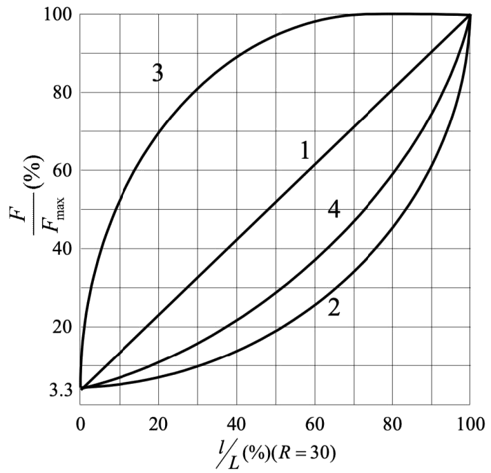 where \(\frac{Q}{Q_{max}}\) denotes the relative flow and \(\frac{l}{L}\) denotes the relative displacement of the valve core. And we define \(R=\frac{Q_{max}}{Q_{min}}=30\). The following graph is acquired when the pressure difference between the front and the back of the vavle stays the same.