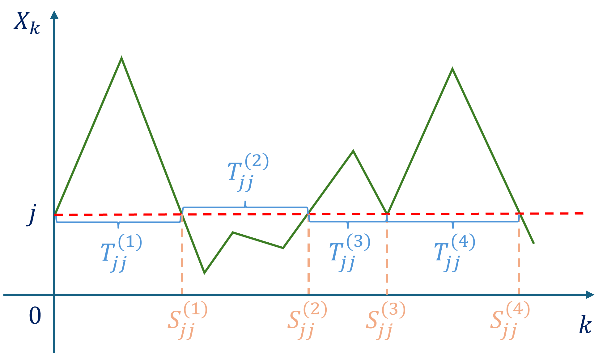 and \(T_0=0\) as default. Define \(\zeta=\#\{l\geq 0: X_{T_l+n}\neq j\}\), which is the number of failing reaching state \(j\) before success after \(T_l+n\) steps (if successfully reaching \(j\), then we stop the routine and return \(l\)). Then easy to see that