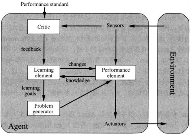 学习元件(Learning element): 根据反馈对agent做评价,修改执行元件