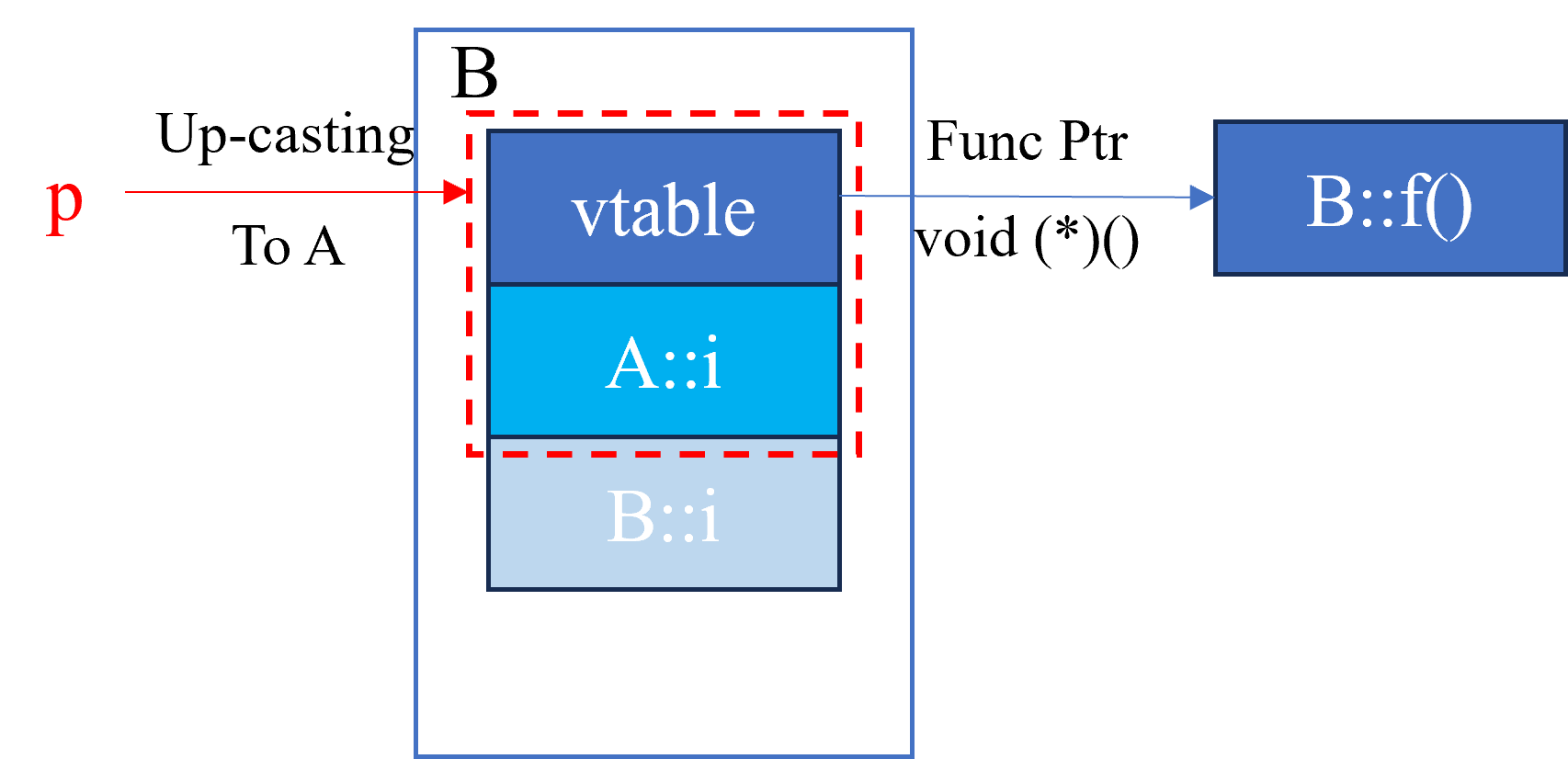 Initialize: A will create A’s vtable but B will than create B’s vtable and change the point to the vtable.